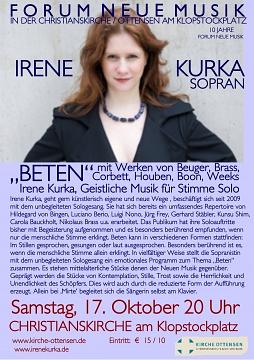 „Beten“ mit Werken von Beuger, Brass, Corbett, Houben, Boon, Weeks.Irene Kurka, Geistliche Musik für Stimme SoloAntoineBeuger Vater unser (2011)James Weeks The World in Tune (2013)Sidney Corbett Gebet (1999) (Text: Pseudo-Dionysios Areopagita)Dante Boon Mirte (Text. Johannes vom Kreuz)Nikolaus Brass Benediktionen (2010)Eva-Maria Houben a-men (2012) Irene Kurka, eine Sopranistin, die gern künstlerisch eigene und neue Wege geht, beschäftigt sich seit 2009 mit dem unbegleiteten Sologesang. Sie hat sich bereits ein umfassendes Repertoire von Hildegard von Bingen, Luciano Berio, Luigi Nono, Jürg Frey, Gerhard Stäbler, Kunsu Shim, Carola Bauckholt, Nikolaus Brass u.a. erarbeitet. Das Publikum hat ihre Soloauftritte bisher mit Begeisterung aufgenommen und es besonders berührend empfunden, wenn nur die menschliche Stimme erklingt. Beten kann in verschiedenen Formen stattfinden: Im Stillen gesprochen, gesungen oder laut ausgesprochen. Besonders berührend ist es, wenn die menschliche Stimme allein erklingt. In vielfältiger Weise stellt die Sopranistin Irene Kurka mit dem unbegleiteten Sologesang ein emotionales Programm zum Thema „Beten“ zusammen.In dem ca. sechzig minütigen Konzert stehen mittelalterliche Stücke denen der Neuen Musik gegenüber. Geprägt werden die Stücke von Kontemplation, Stille, Trost sowie die Herrlichkeit und Unendlichkeit des Schöpfers. Dies wird auch durch die reduzierte Form der Aufführung, wenn die Sängerin ihre Werke solistisch vorträgt, erzeugt. Allein bei ‚Mirte‘ begleitet sich die Sängerin selbst am Klavier. Mit „Beten“ ist es ihr gelungen, ein Soloprogramm zum Thema „Beten“ zusammenzustellen. https://www.irenekurka.de
