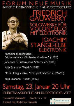DAS VIOLONCELLO IN DER AUSEINANDERSETZUNG MIT ELEKTRONISCHEN MEDIEN Karlheinz Stockhausen: "Violoncello aus Orchester-Finalisten"Johannes S. Sistermanns: "inter vue" Kaija Saariaho: „Petals“ Mesias Maiguashka: "The spirit catcher" Kaija Saariaho: "Pres" FRIEDRICH GAUWERKY, VioloncelloJOACHIM STANGE-ELBE, ElektronikDie Auseinandersetzung mit anderen Medien ist ein Teil meiner permanenten Arbeit. In einer von der Elektronischen Revolution der letzten Jahrzehnte entscheidend geprägten Zeit ist die Auseinandersetzung mit elektronischen Medien grundsätzlich von wesentlichem Interesse. Das gilt auch für meine Arbeit als Musiker. Der Einsatz von solchen Medien in diesem Programm ist von außerordentlich unterschiedlicher Art. Während bei dem Werk von Stockhausen die einfachste Form der Elektronik vorliegt, nämlich vorkomponierte Zuspielmusik, ist das bei dem Werk von Sistermanns schon anders. Zwar ist auch bei diesem Werk zu dem Spiel des Cellisten eine Zuspielmusik komponiert, die wird allerdings nicht über Lautsprecher im Aufführungsraum abgespielt, sondern mittels eines so genannten Transducers auf den Korpus des Instrumentes übertragen, womit dieser quasi als Lautsprecher fungiert. Somit kommen Instrumentalspiel und Zuspielmusik aus derselben Schallquelle.Wesentlich erweitert durch den Einsatz von elektronischen Anwendungen wird der Cello-Klang in den Werken von Saariaho und Maiguashka: beide verwenden Harmonizer (mikrotonale Klangverschärfung) und Reverb (Nachhall), das Werk von Maiguashka dazu das Mittel der Wiederholung gewisser Abschnitte durch zeitverzögerndes Instrumentarium (delay). Bei dem Werk „Pres“ von Kaija Saariaho gibt es dann zum Spiel des Cellisten Noch eine Fülle von live-elektronischen Ereignissen: Neben mikrotonaler Klangverschärfung und künstlichem Nachhall werden im Verlaufe des Werkes ca. 70 Soundfiles eingespielt. Den Zeitpunkt des Einspielens bestimmt der Solist nach Angaben in der Partitur mittels eines Fußpedals, das er neben seinem Spiel laufend selbst zu bedienen hat.F.G.Konzert des Deutschen Musikrats